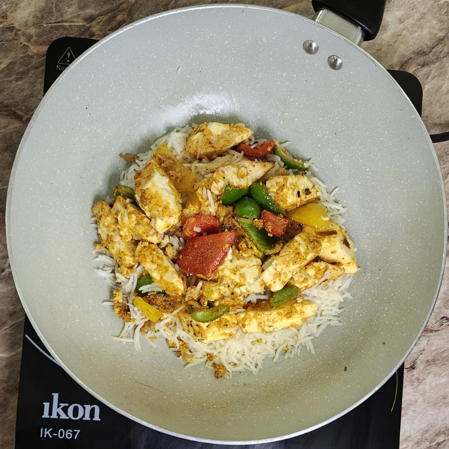 Heat AU4 (oil & butter) in a pan and pan-fry the marinated paneer and capsicum. Set aside.