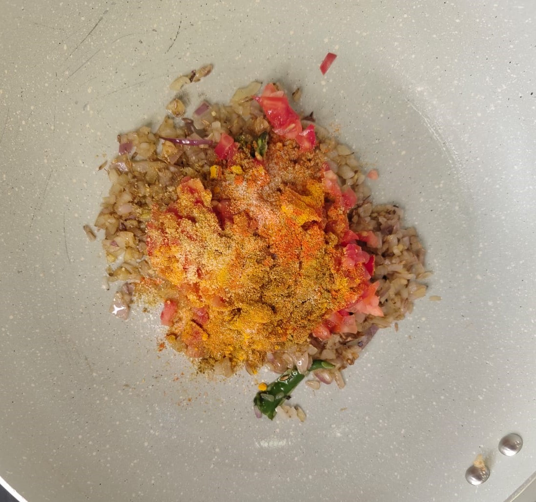 Add AL3 (Tomatoes) and AL4 (Spice Mix), cook 3-4 mins until oil separates.