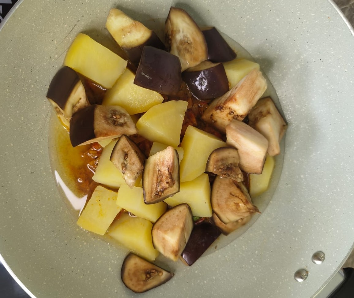 Add AL5 (Potatoes) and AL6 (Eggplant) with 100 ml water, cover and cook 6-8 mins until tender.