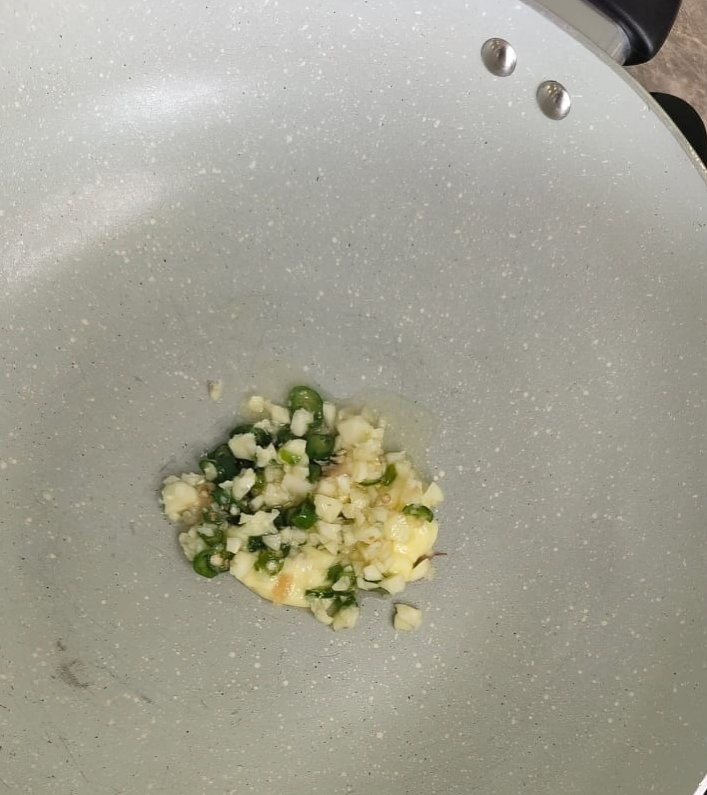 Heat a pan, add DE2 (Oil pack) and sauté for 30 sec.