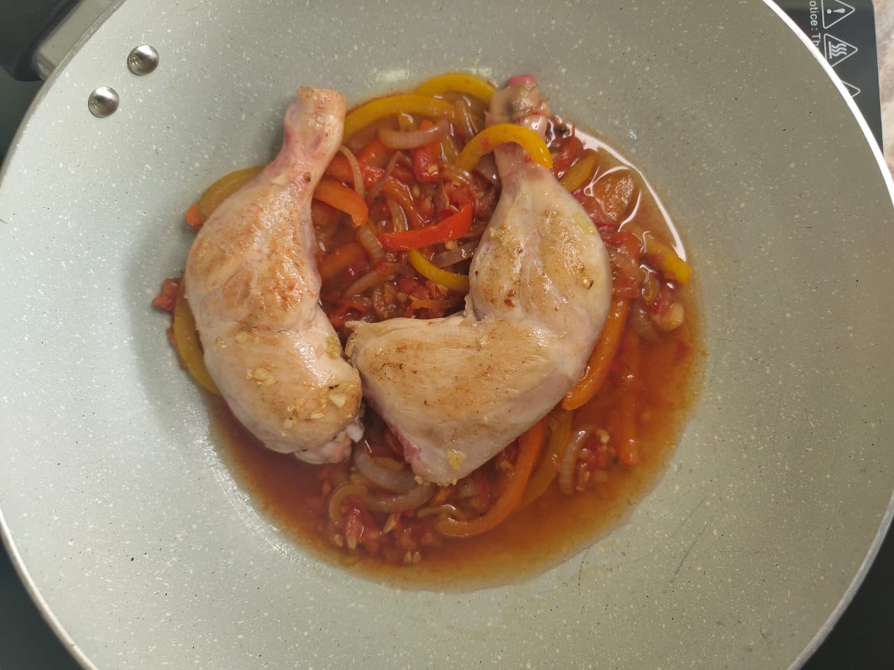 Return the browned chicken to the pan. Add PO6 pack (Stock), cover, and simmer on medium-low heat for 12-15 minutes until chicken is fully cooked and tender.