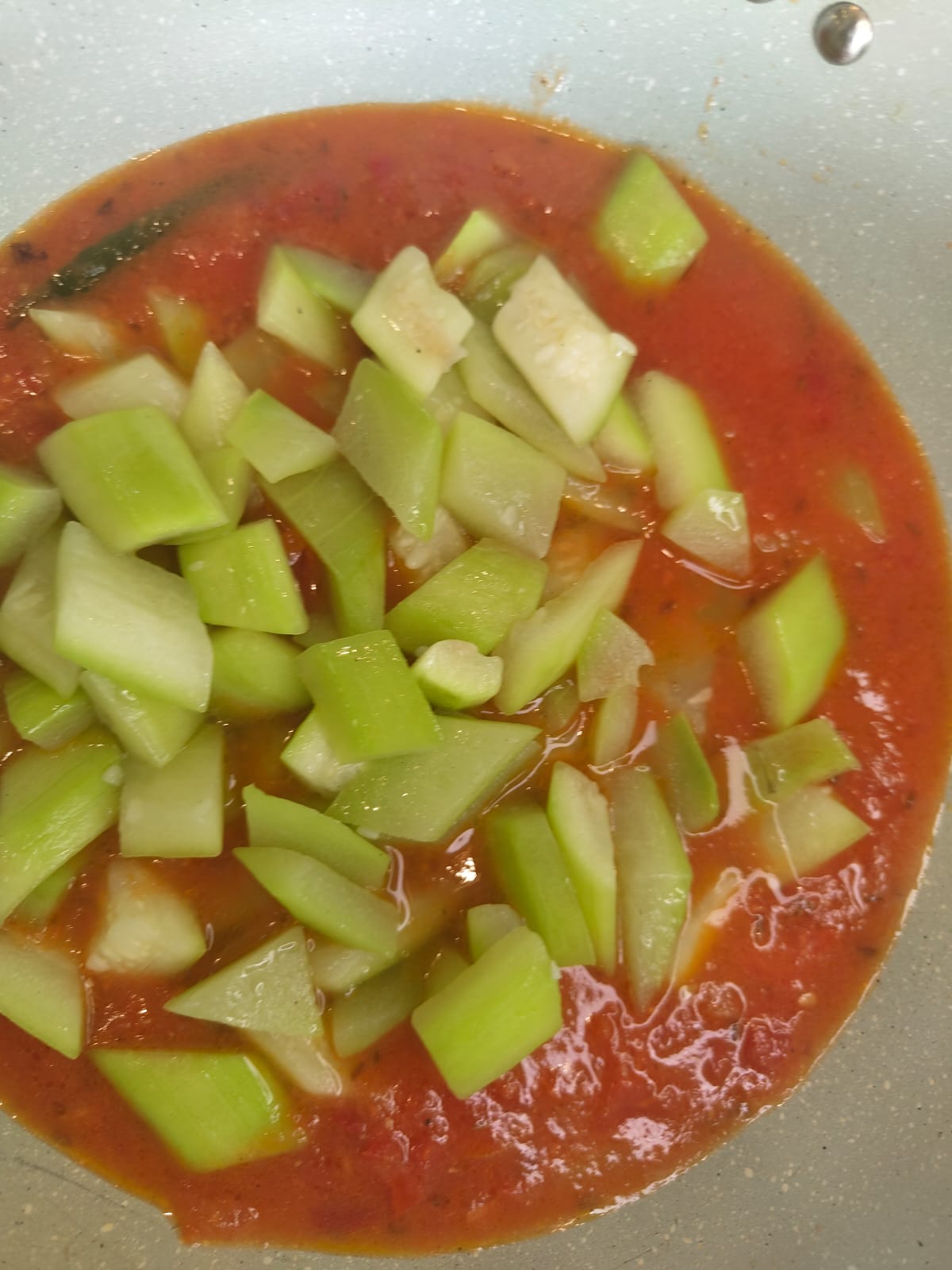 Add the cooked bottle gourd back to the pan and simmer for 2 minutes until it reaches a semi-dry consistency.