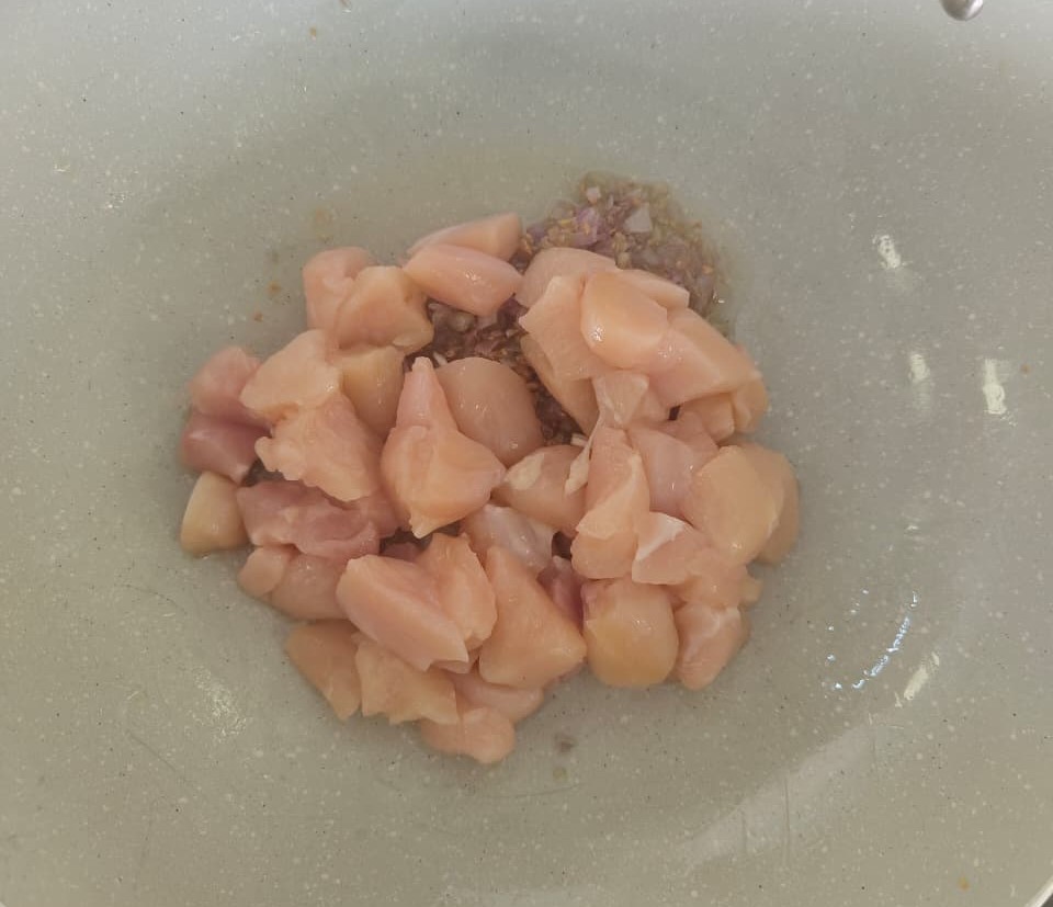 Add EU3 pack (Chicken) and sauté for 3-4 minutes until lightly cooked.