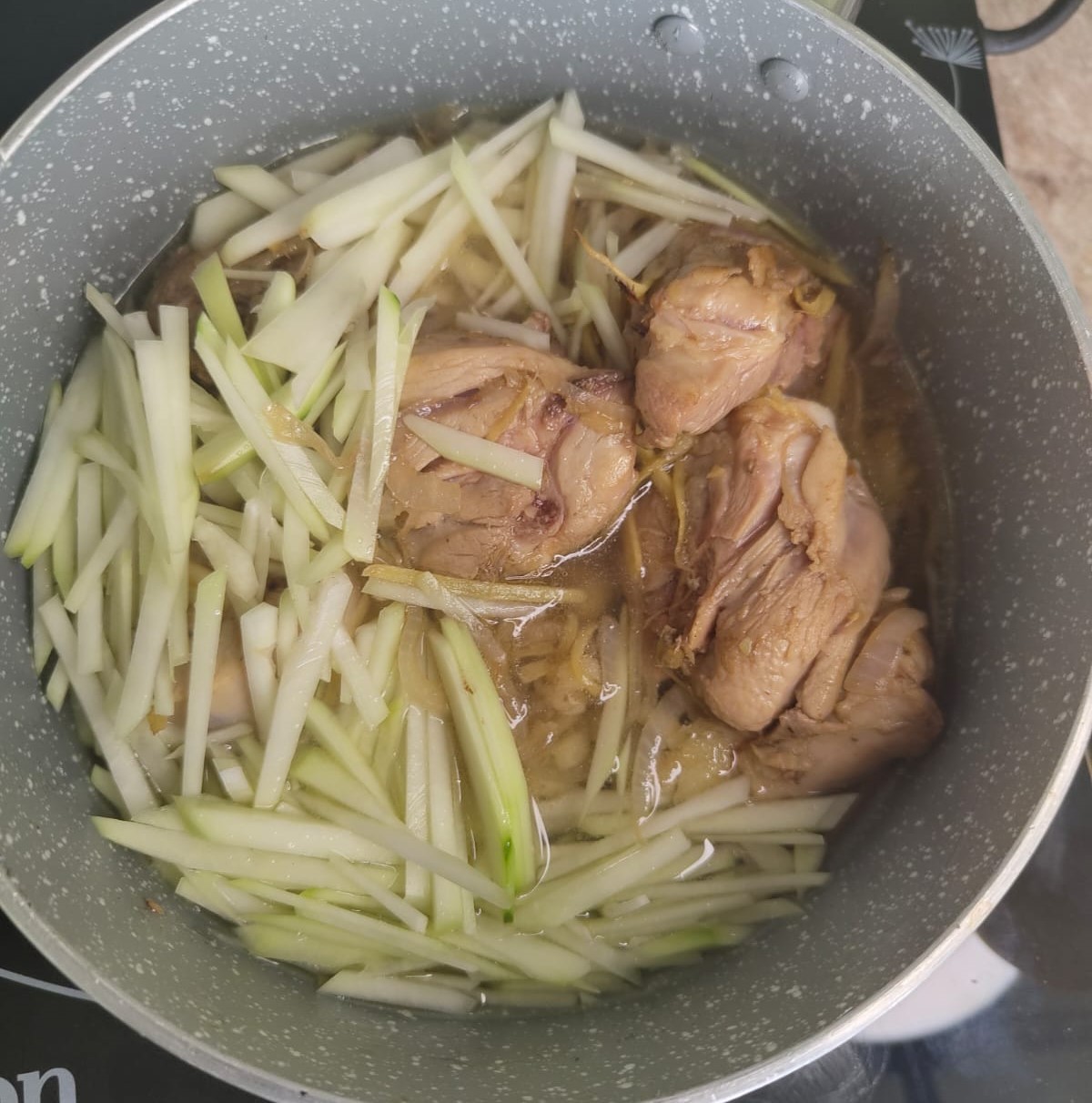 Add TG4 pack (Green Papaya), sauté for 3 minutes, then add 3–4 cups water; bring to a boil and simmer for 12 minutes until the papaya is tender.