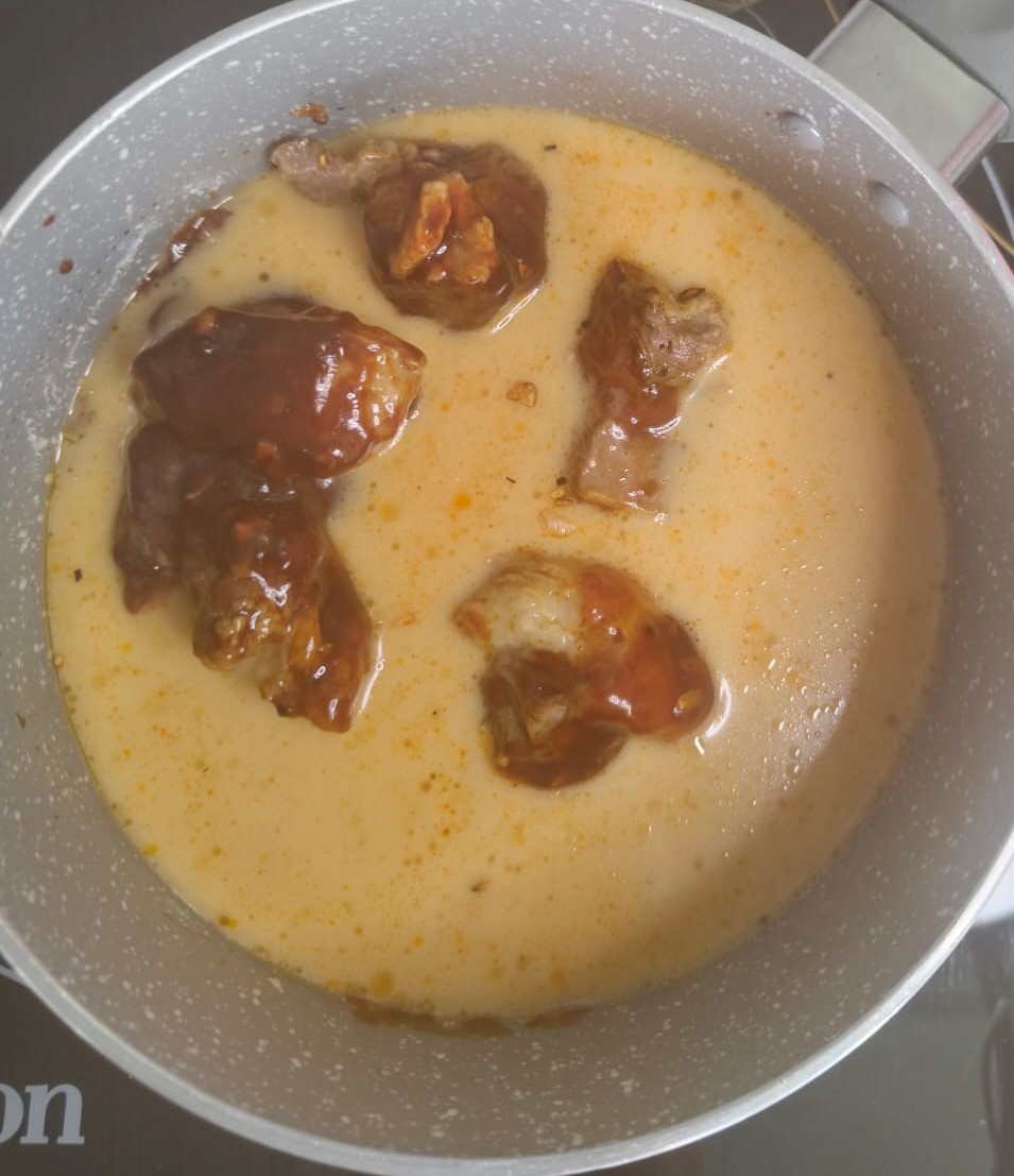 Add KB4 pack (Sauce Mix), mix well, then add KB5 pack (Coconut Milk) with ½ cup water and simmer for 10 minutes.