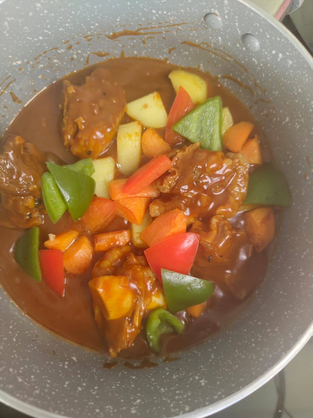Add KB6 pack (Potato, Carrot) and KB7 pack (Red & Green Capsicum); mix gently and simmer for 3-4 minutes until vegetables are tender.
