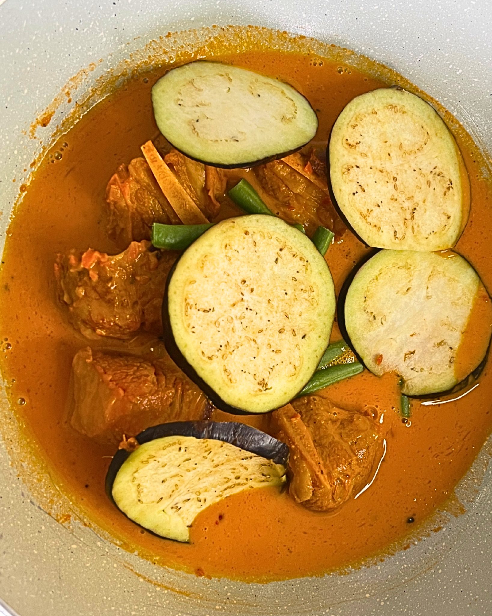 Add KE5 pack (Eggplant, String Beans) and simmer until the vegetables are tender.