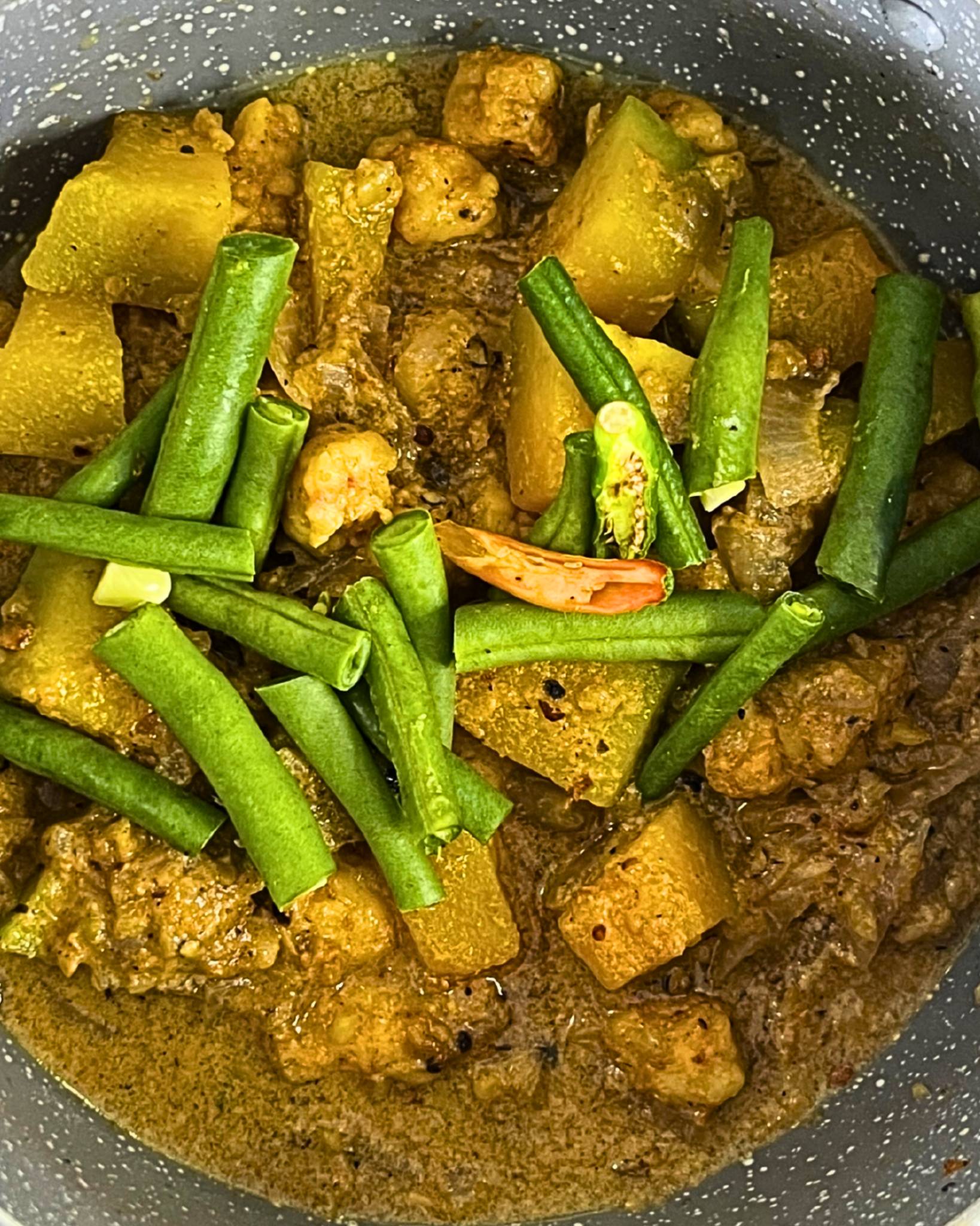 Add the remaining GG6 pack (Sitaw, Long Green Chilli) and simmer for 4–5 minutes until vegetables are tender.