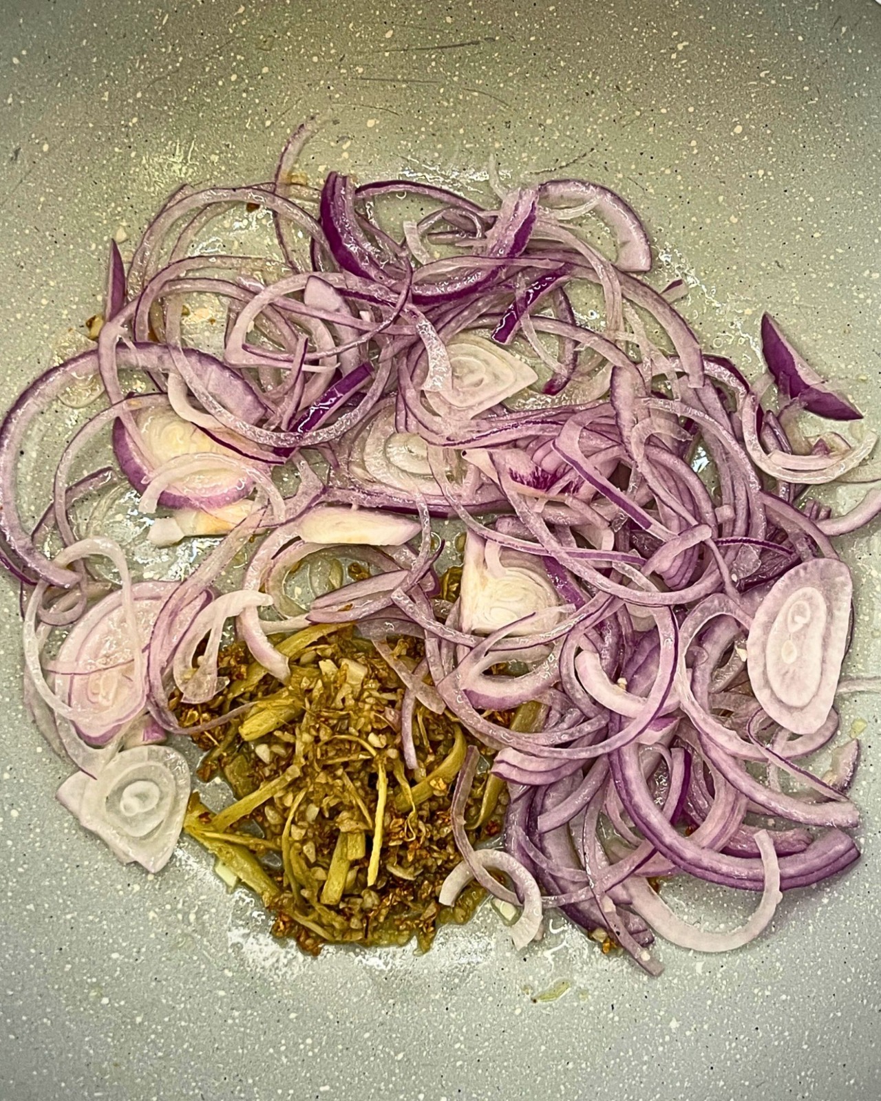 In a clean pan, heat DA3 pack (Oil pack) and add DA4 pack (Onion); sauté until aromatic.
