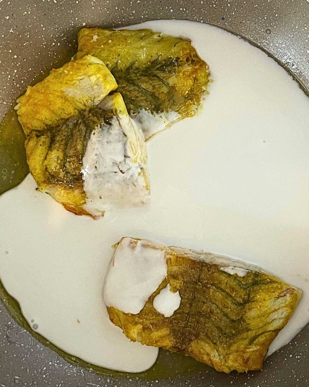 Return the fried DA2 pack (Fish) to the pan, add DA7 pack (Coconut Cream), and simmer for 2–3 minutes.
