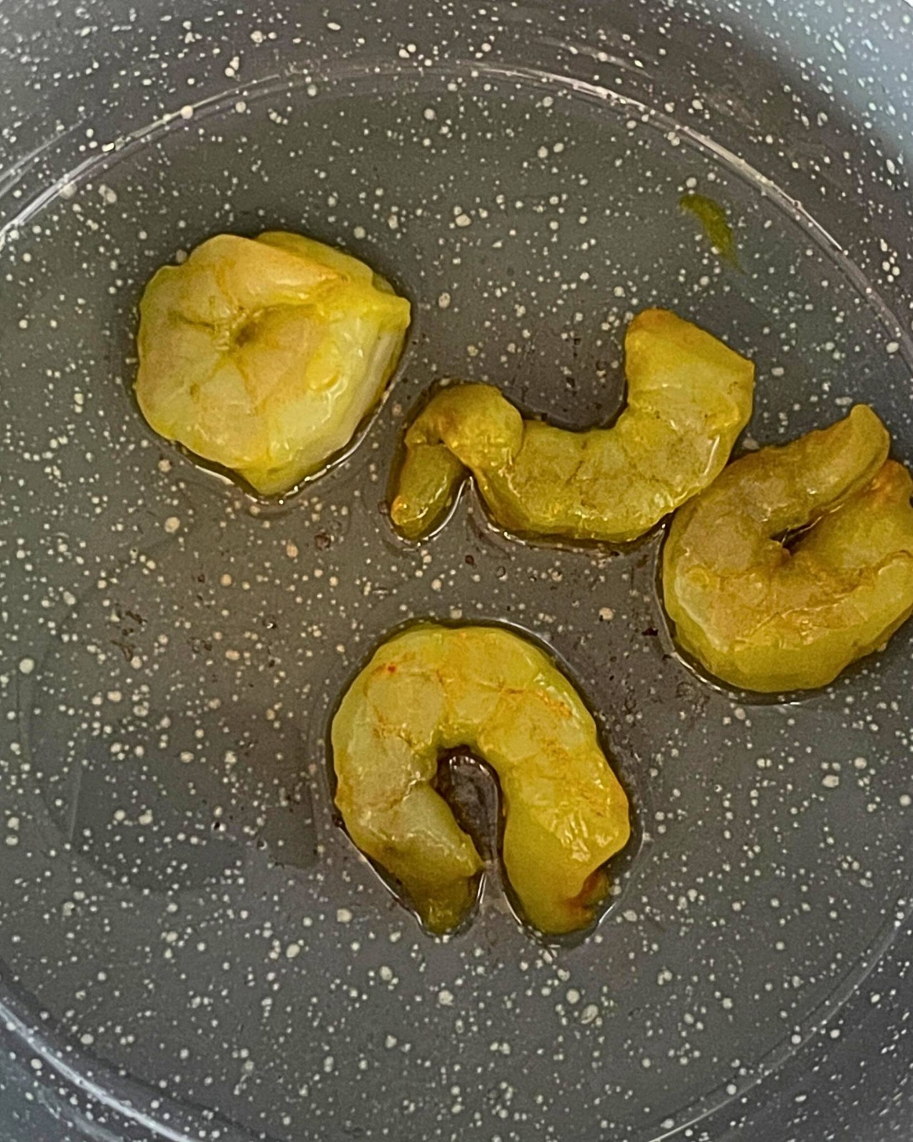 Heat UY1 pack (Oil pack) in a pan or wok on medium-high flame; stir fry UY2 (prawn) for a minute, remove from the pan and set aside.