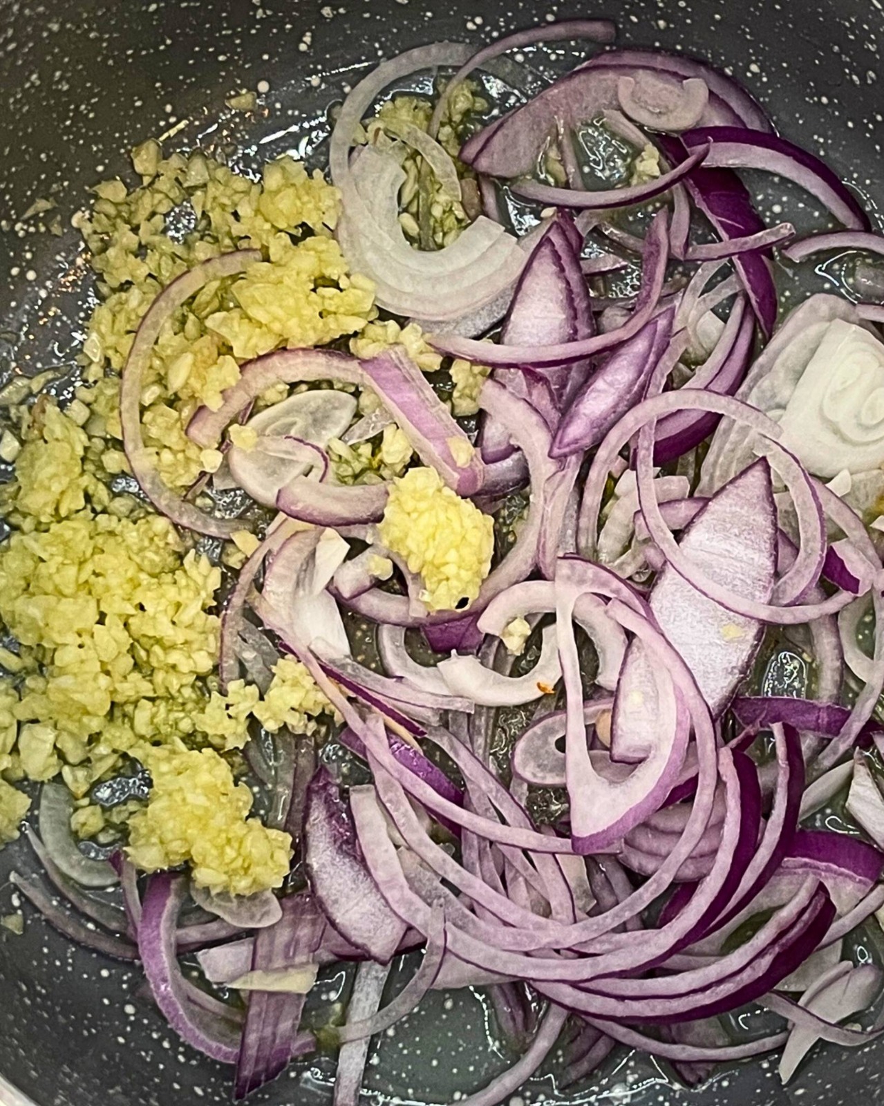On the same pan, saute UY3 and UY4 packs (garlic and onion) until aromatic.