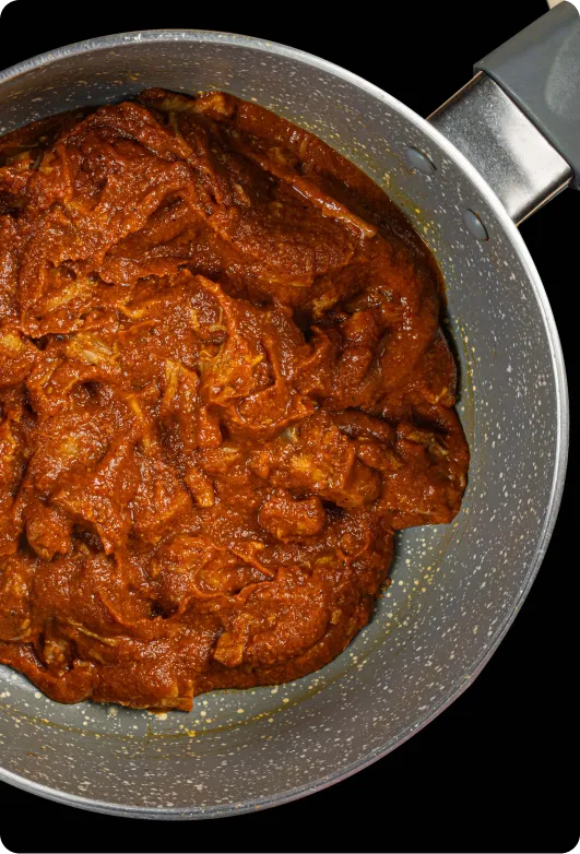 Add ZM2 (red chilly paste), sauté briefly, then add ZM3 (onion paste) and cook 1–2 mins, followed by ZM4 (mutton) sautéed for 1 min.