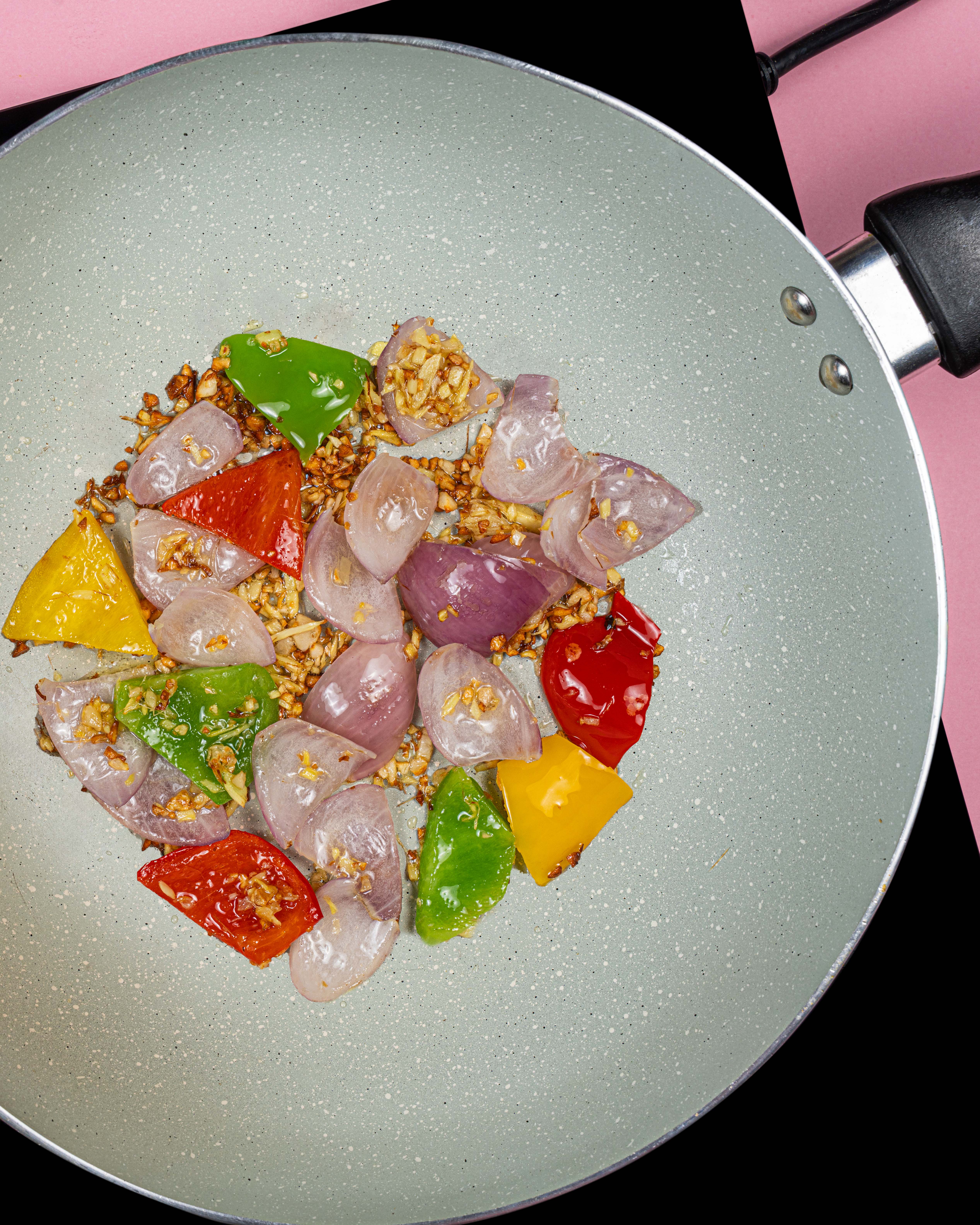 Add PR5 pack (diced onion, capsicum) and sauté for another 30 seconds.